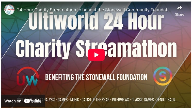Ultiworld is hosting their first-ever 24-hour livestream, raising money for the Stonewall Community Foundation — a charity by and for the LGBTQ+ community.